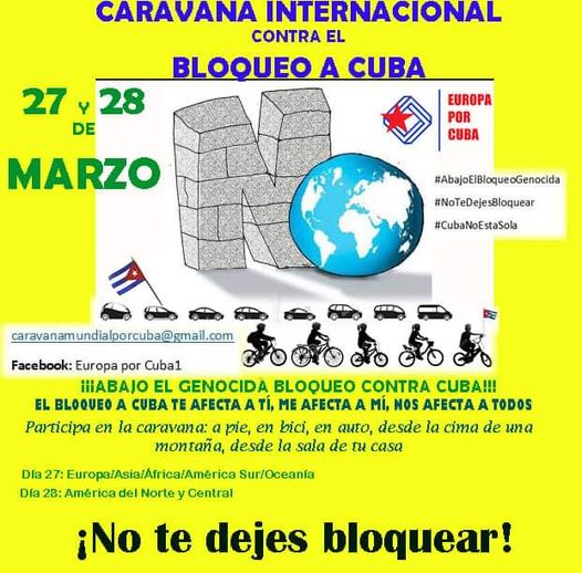 По каналу европейских солидарников с Кубинской революцией "Европа за Кубу", в координации с братскими каналами и в сотрудничестве с солидарниками с нескольких континентов мы выступили с призывом к проведению двухдневных мероприятий против блокады, введенной правительством США против самой крупной из Антильских островов. Мероприятия будут носить глобальный характер и состоятся 27 и 28 марта 2021 года.