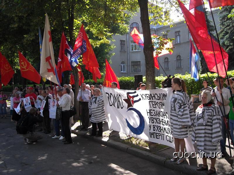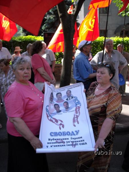 10 июня 2009 годаБолее 100 активистов Украинского Национального Комитета "За свободу Пяти Героев Кубы", собрались ранним утром напротив здания посольства США в Киеве, с требованиями к президенту США Обаме немедленного освобождения наших Пяти Братьев, которые вот уже почти 11 лет несправедливо заключены в тюрьмах империи. Активисты, среди которых члены Ассоциации дружбы Украина - Куба, Коммунистической Партии Украины, журнала Пропаганда, Ассоциации воинов-интернационалистов - "кубинцев" Украины, Международного Чернобыльского Фонда, Молодежного движения «Че Гевара», Общевоинского союза Украины, Прогрессивной Социалистической Партии Украины, Организации марксистов, Большевистской Партии, Ленинского Комсомола, а также другие организации, которые составляют Движение солидарности с Кубинской Революцией в Украине, несли транспаранты, флаги и фотографии за свободу Пяти Героев. 15 ораторов, среди которых преподаватель Василий Пихорович, генерал Михаил Лопатин, депутат Олег Калашников, в своих выступлениях осудили постоянные препятствия чинимые правительством США в аппеляции по несправедливому решению суда по делу пятерых кубинцев. Два канала центрального телевидения и несколько печатных изданий направили своих журналистов для освещения этой манифестации, которая проходила с 9 до 11 часов утра. В ходе акции звучали кубинские песни, марши и Национальный Гимн Кубы. Манифестанты скандировали: Viva Куба!, Viva Фидель!, Free the Five! Все участники подписали письмо, направленное к президенту США с требованиями выдать известного террориста Луиса Посада Каррилеса и освобождать Херардо, Рамона, Антонио, Фернандо и Рене. Это послание было оглашено публично и затем передано служащими посольства США.
