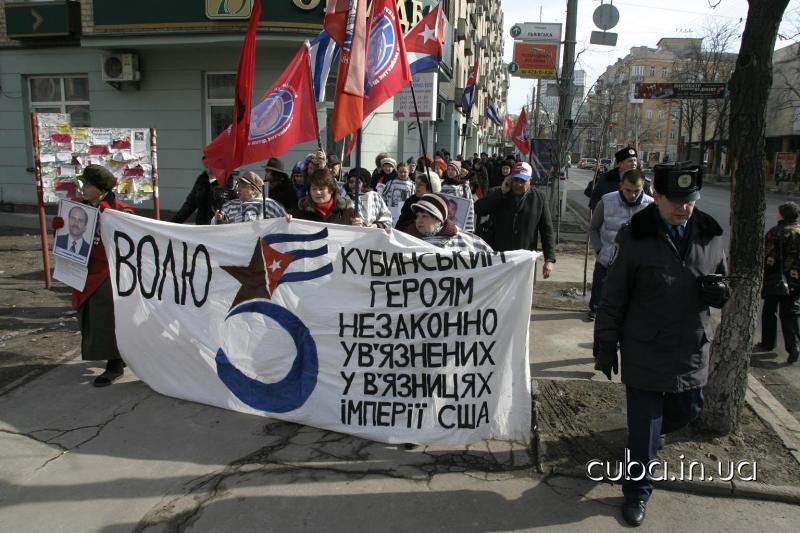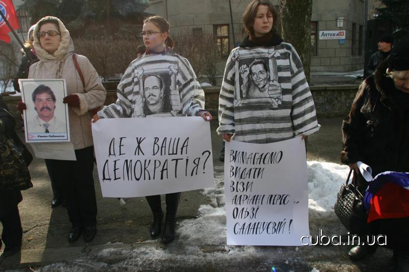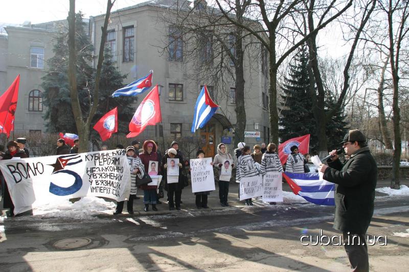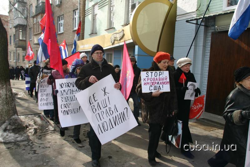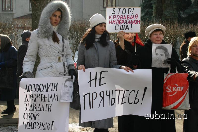10 марта 2011года10 числа, украинские женщины (представительницы различных ассоциаций) пришли к посольству США, чтобы выполнить почетную миссию, то есть, заявить о своих проблемах. Почему они решили поделиться ими именно с работниками сего ведомства? Ведь логичнее было бы высказаться у стен, скажем, Кабинета Министров. Ответ прост. Украинских женщин сегодня заботит судьба кубинских представительниц слабого пола, а именно: Адрианы и Ольги, то есть двух жен кубинских Антитерористов, ведь за все двенадцать с половиной лет им не дают возможности встретиться со своими мужьями. Либо им не выдают визы, либо же, когда они приезжают, их мужья в это время пребывают в карцере, в связи с которым, естественно, любые свидания отменяются. «Где же Ваша демократия? Где же Ваши права человека?» - спрашивали украинки, не выпуская из рук плакатов с этими вопросами, выглядевшими, как упрек всему сказанному Штатами о свободе. На два простых вопроса ответы не получены. Только напряженная тишина по другую сторону улицы, в контраст заводной «Guantanamera», пританцовывая под которую не ощущаешь весенней прохлады. Но не нужно думать, что за митингом наблюдал только наряд милиции, расположившийся напротив, как почетный караул перед Букингемским Дворцом. Естественно, в окнах никто не появлялся, но любопытство взяло верх, и сотрудники посольства наблюдали на улице, в стороне, попивая кофе, и думая, что дерево их надежно скрывает от глаз митингующих.