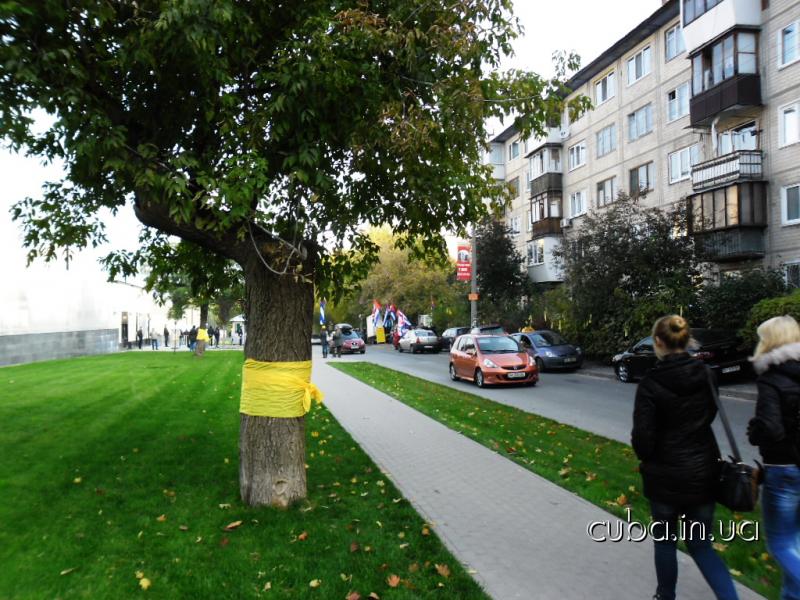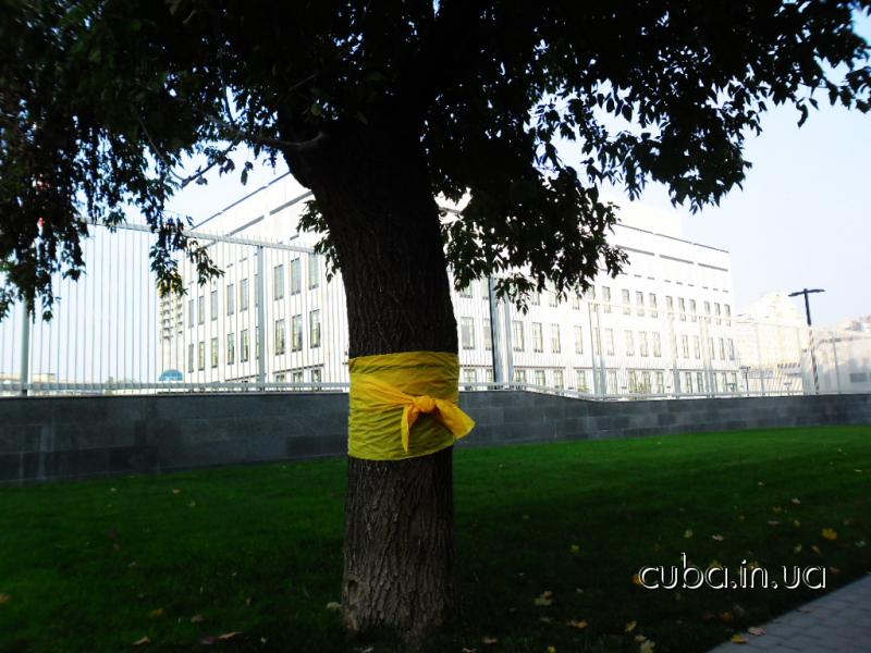 Вокруг американского посольства не осталось ни одного дерево, ни одного куста, на котором бы не были завязаны желтые ленты. И это, учитывая, что посольство в Киеве является самым масштабным на сегодняшний день посольством США в Европе, занимая 11 гектаров бывшего парка имени Ленинского Комсомола.