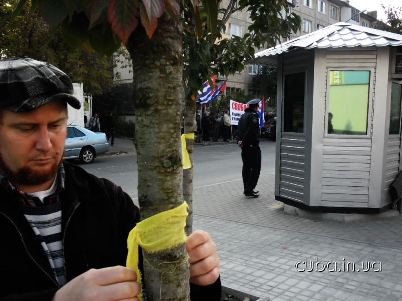 Участники митинга в Киеве завязали более 350 желтых ленточек по всему четырехсотметровому периметру американского посольства, чтобы таким образом обратить внимание американского народа к делу Пяти кубинских антитеррористов, и потребовать от правительства Обамы освободить Герардо, Рамона, Антонио и Фернандо, более 15 лет несправедливо заключенных в тюрьмах США, и вернуть их на Кубу.