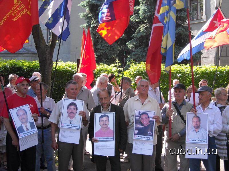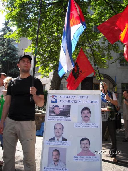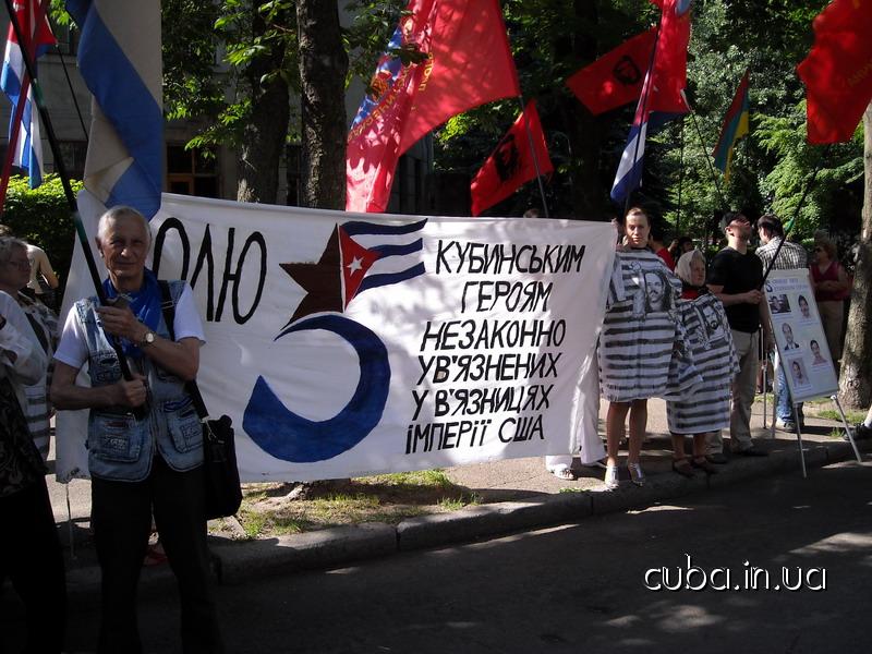 10 июня 2009 годаБолее 100 активистов Украинского Национального Комитета "За свободу Пяти Героев Кубы", собрались ранним утром напротив здания посольства США в Киеве, с требованиями к президенту США Обаме немедленного освобождения наших Пяти Братьев, которые вот уже почти 11 лет несправедливо заключены в тюрьмах империи. Активисты, среди которых члены Ассоциации дружбы Украина - Куба, Коммунистической Партии Украины, журнала Пропаганда, Ассоциации воинов-интернационалистов - "кубинцев" Украины, Международного Чернобыльского Фонда, Молодежного движения «Че Гевара», Общевоинского союза Украины, Прогрессивной Социалистической Партии Украины, Организации марксистов, Большевистской Партии, Ленинского Комсомола, а также другие организации, которые составляют Движение солидарности с Кубинской Революцией в Украине, несли транспаранты, флаги и фотографии за свободу Пяти Героев. 15 ораторов, среди которых преподаватель Василий Пихорович, генерал Михаил Лопатин, депутат Олег Калашников, в своих выступлениях осудили постоянные препятствия чинимые правительством США в аппеляции по несправедливому решению суда по делу пятерых кубинцев. Два канала центрального телевидения и несколько печатных изданий направили своих журналистов для освещения этой манифестации, которая проходила с 9 до 11 часов утра. В ходе акции звучали кубинские песни, марши и Национальный Гимн Кубы. Манифестанты скандировали: Viva Куба!, Viva Фидель!, Free the Five! Все участники подписали письмо, направленное к президенту США с требованиями выдать известного террориста Луиса Посада Каррилеса и освобождать Херардо, Рамона, Антонио, Фернандо и Рене. Это послание было оглашено публично и затем передано служащими посольства США.