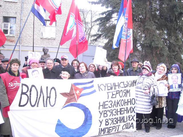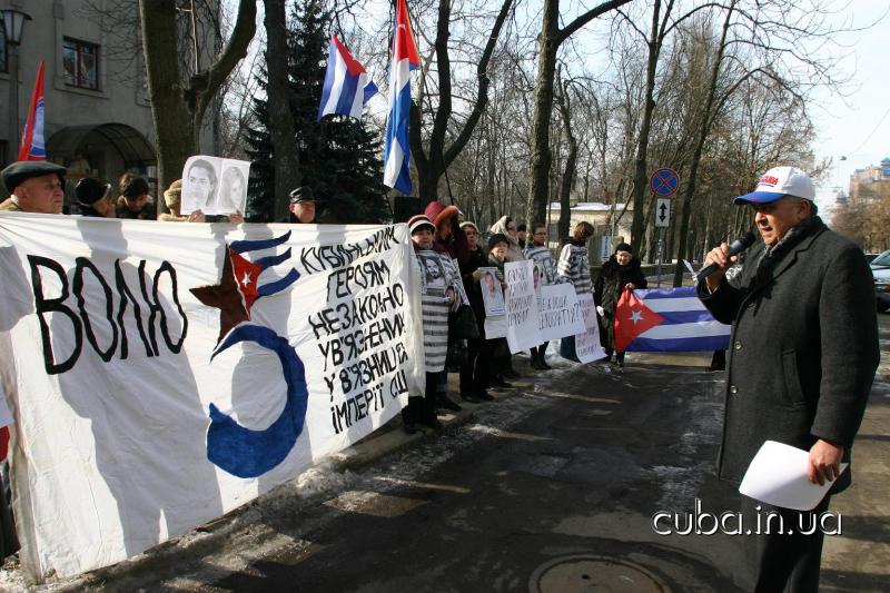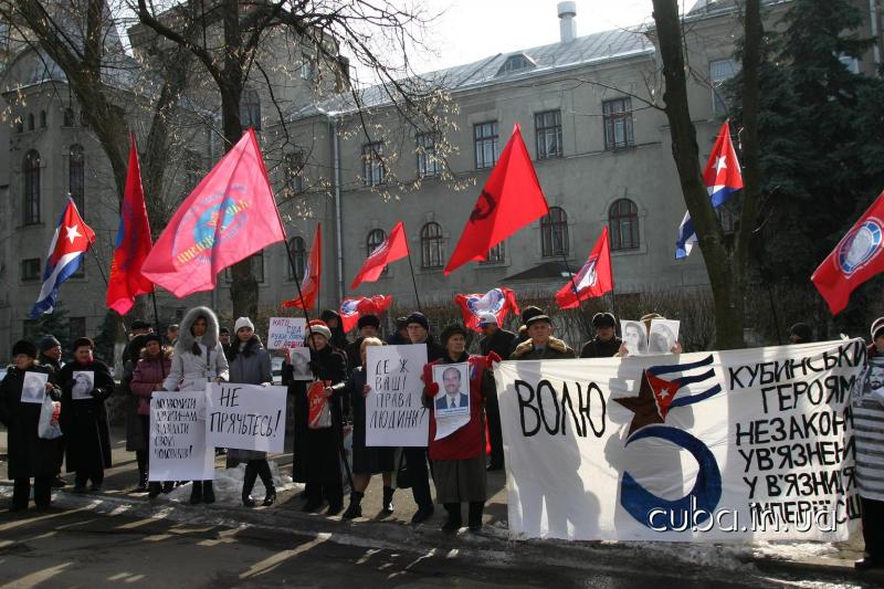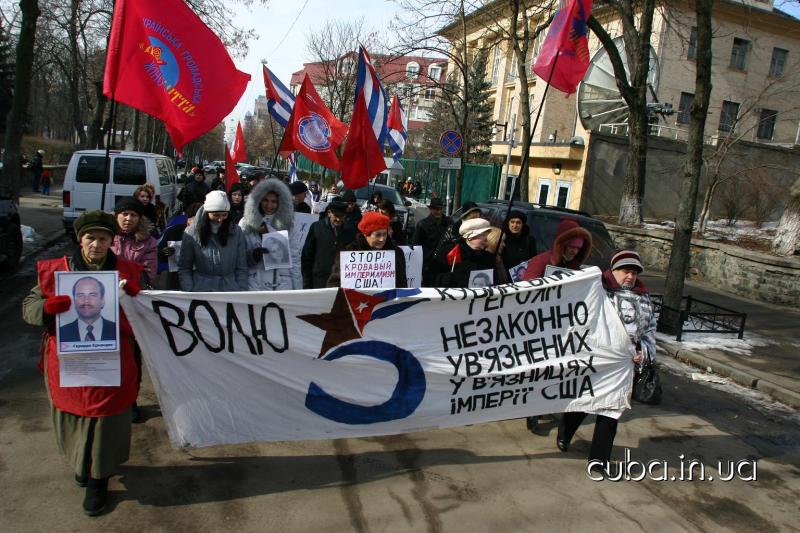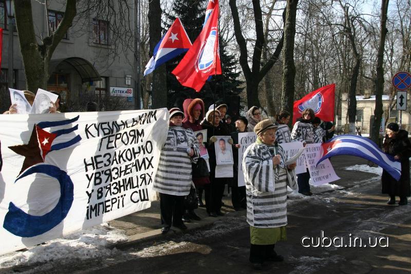 10 марта 2011года10 числа, украинские женщины (представительницы различных ассоциаций) пришли к посольству США, чтобы выполнить почетную миссию, то есть, заявить о своих проблемах. Почему они решили поделиться ими именно с работниками сего ведомства? Ведь логичнее было бы высказаться у стен, скажем, Кабинета Министров. Ответ прост. Украинских женщин сегодня заботит судьба кубинских представительниц слабого пола, а именно: Адрианы и Ольги, то есть двух жен кубинских Антитерористов, ведь за все двенадцать с половиной лет им не дают возможности встретиться со своими мужьями. Либо им не выдают визы, либо же, когда они приезжают, их мужья в это время пребывают в карцере, в связи с которым, естественно, любые свидания отменяются. «Где же Ваша демократия? Где же Ваши права человека?» - спрашивали украинки, не выпуская из рук плакатов с этими вопросами, выглядевшими, как упрек всему сказанному Штатами о свободе. На два простых вопроса ответы не получены. Только напряженная тишина по другую сторону улицы, в контраст заводной «Guantanamera», пританцовывая под которую не ощущаешь весенней прохлады. Но не нужно думать, что за митингом наблюдал только наряд милиции, расположившийся напротив, как почетный караул перед Букингемским Дворцом. Естественно, в окнах никто не появлялся, но любопытство взяло верх, и сотрудники посольства наблюдали на улице, в стороне, попивая кофе, и думая, что дерево их надежно скрывает от глаз митингующих.