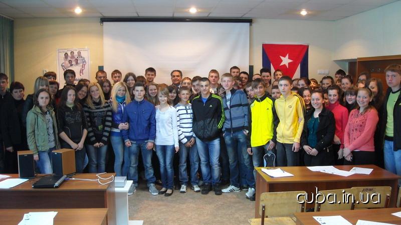Начался визит с общения с молодым украинским поколением – школьниками старших классов ЗОШ №25. Им было рассказано о Кубе, о кубинском народе, о дружбе между нашими народами. О необходимости помогать менее развитым народам и проявлять человеком интернационализм во всех своих делах. В подтверждение был показан документальный фильм «Чернобыль в нашем сердце» о бескорыстной программе лечения украинских детей, пострадавших от чернобыльской катастрофы, на Кубе.