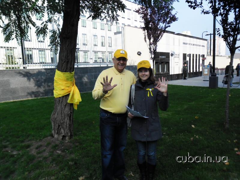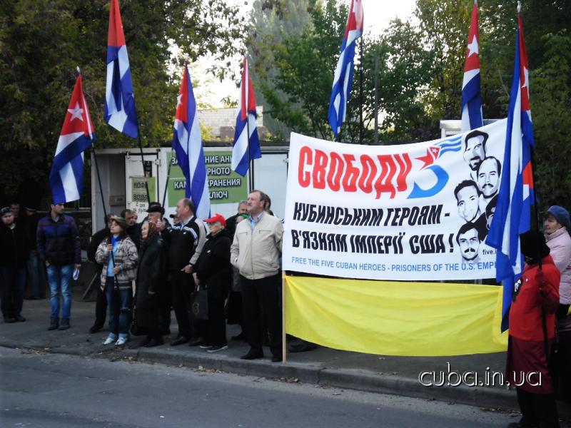 9 октября 2013 годаБолее тридцати активистов Украинского Национального Комитета «За свободу Пяти Героев Кубы» собрались перед посольством США в Киеве в среду 9 октября 2013 года, чтобы принять участие в акции «Завяжи жёлтую ленту на дерево за свободу Пяти кубинцев».
